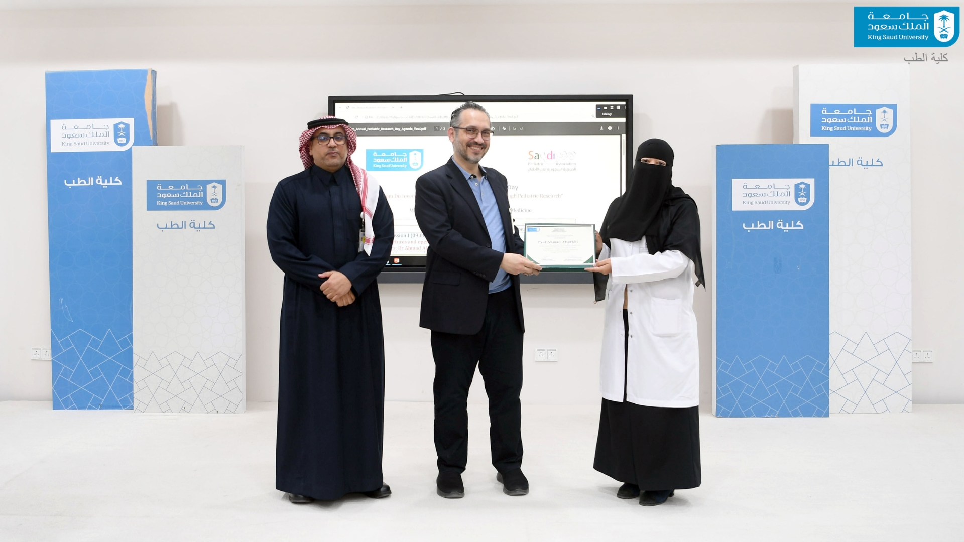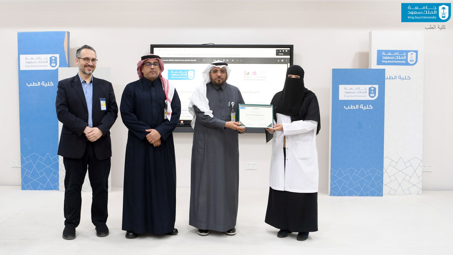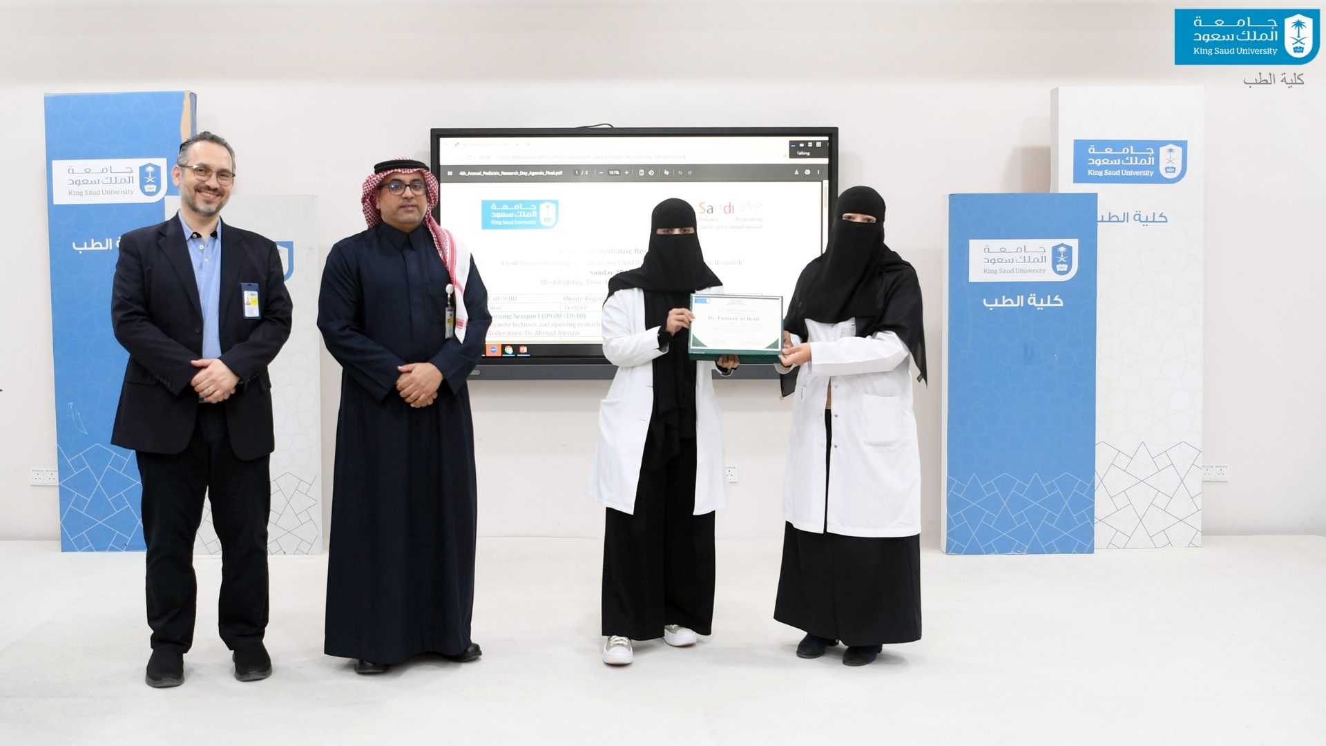 نيابةً عن عميد كلية الطب افتتحت وكيلة الكلية للشؤون الأكاديمية أ.د منى بنت محمد سليمان، مؤخرًا فعالية "اليوم البحثي الرابع لطب الأطفال بتنظيم قسم طب الأطفال في الكلية، وبالشراكة مع جمعية طب الأطفال السعودية؛ بهدف إبراز الإنتاج العلمي في مجال طب الأطفال، وتعزيز ثقافة البحث العلمي، ودعم الباحثين، وتشجيع الطلاب والطالبات على تقديم ملخصات بحثية تسهم في رفع جودة الرعاية الصحية للأطفال بحضور نخبة من الباحثين وأعضاء هيئة التدريس في طب الأطفال. حيث شمل البرنامج عرض أبحاث علمية متخصصة، ومناقشة الملخصات البحثية المقدمة متناولاً شكلاً لليوم البحثي بمنصة ملهمة لاستعراض أبحاث نوعية، وتعزيز التعاون العلمي محليًا ودوليًا، مع التركيز على دور الابتكار والذكاء الاصطناعي في الارتقاء بصحة الطفل. وقد شهدتْ الفعالية تكريم 6 من الباحثين والمهتمين في مجال طب الأطفال، تقديرًا لمساهماتهم العلمية المميزة.