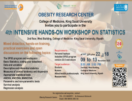 ينظم المركز الجامعي لأبحاث السمنة في كلية الطب و بالتعاون مع وحدة الفعاليات والمؤتمرات في الكلية ورشة العمل المكثفة الرابعة في الاحصاء الحيوي خلال الفترة من 09- 13 نوفمبر 2025م. رابط التسجيل: http://obesitycenter.ksu.edu.sa/en/node/1618#t …