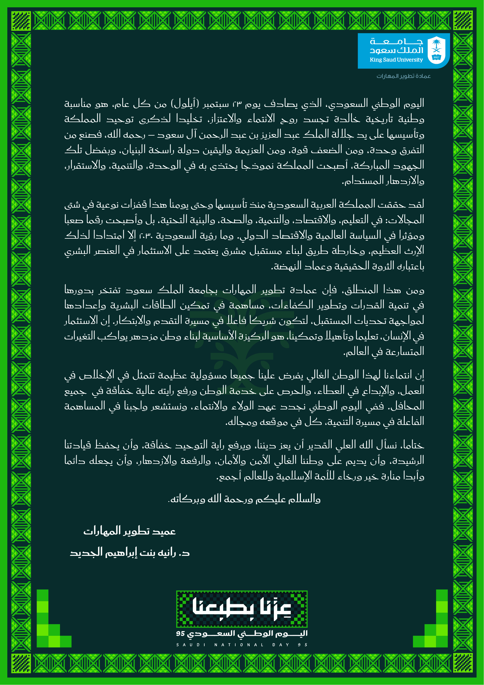 كلمة سعادة عميد عمادة تطوير المهارات بمناسبة اليوم الوطني السعودي 95
