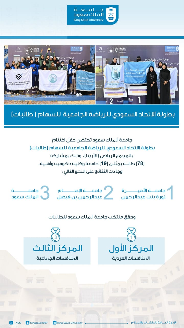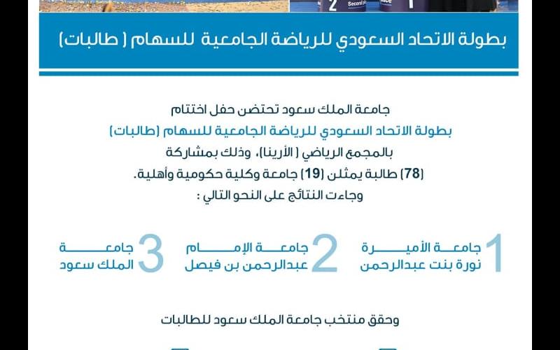 ويأتي تنظيم هذا الحدث الرياضي الكبير، تأكيدًا على حرص جامعة الملك سعود على تمكين الطالبات رياضيًا، وتوفير بيئة تنافسية محفزة تساهم في تطوير مهاراتهن وتعزيز روح المنافسة الشريفة بين الجامعات، حيث فاز منتخب جامعة الملك سعود للطالبات للسهام بالمركز الثالث، وحقق المنتخب المركز الأول في المنافسات الفردية، والمركز الثالث في المنافسات الجماعية..