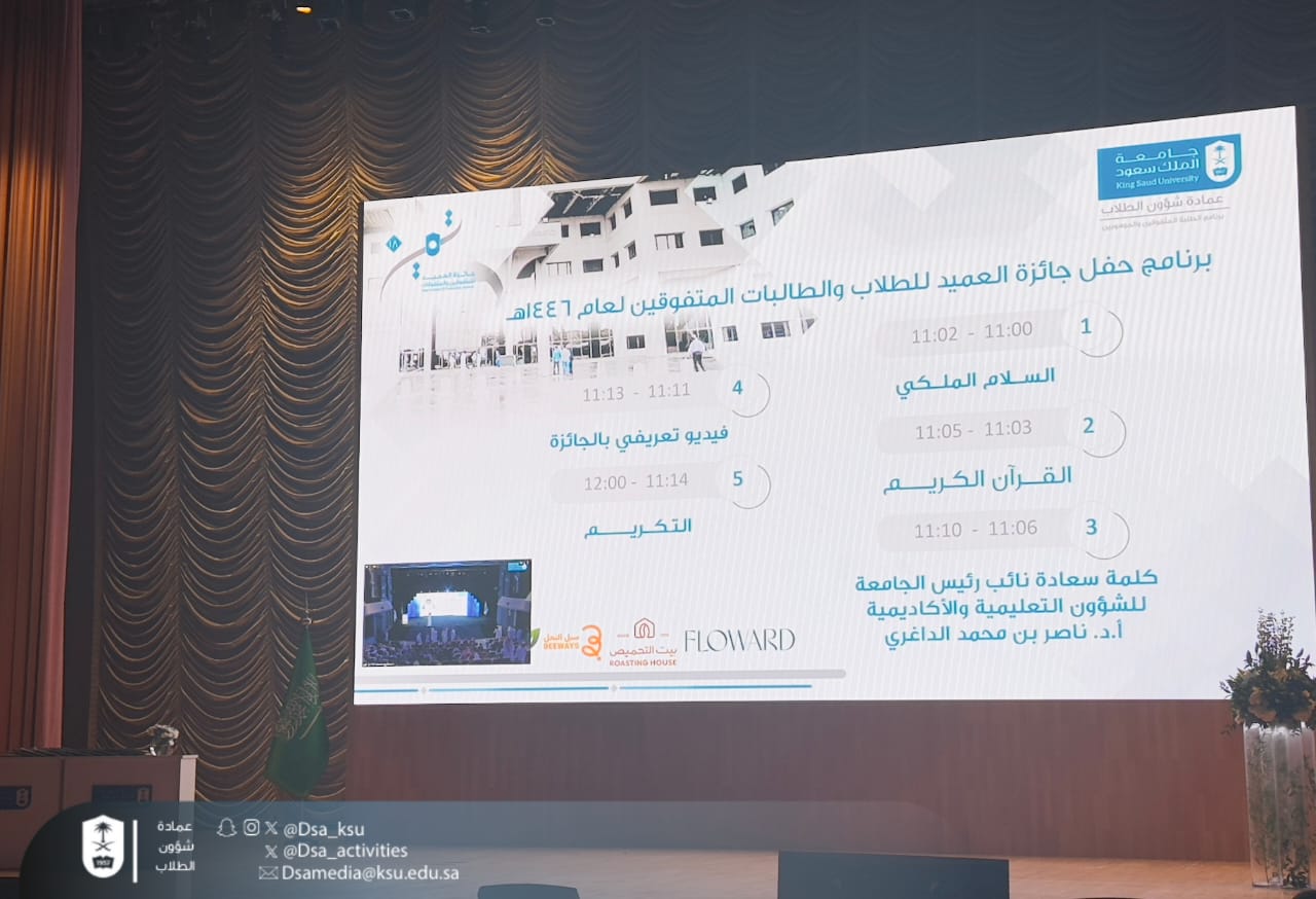 كتبت/ أروى القحطانيبرعاية رئيس جامعة الملك سعود المكلّف الأستاذ الدكتور علي بن محمد المسلّمي، وبحضور نائب رئيس الجامعة للشؤون التعليمية والأكاديمية الاستاذ الدكتور ناصر الداغري، ونوّاب رئيس الجامعة، وعمداء الكليات، وأعضاء هيئة التدريس، نظّمت عمادة شؤون الطلاب برئاسة الأستاذ الدكتور علي بن كناخر الدلبحي واشراف وكيل عمادة شؤؤن الطلاب للخدمات الطلابية أ.د. طلال الحزيمي حفل "جائزة العميد للطلاب والطالبات المتفوقين 18" للعام الجامعي 1446هـ.