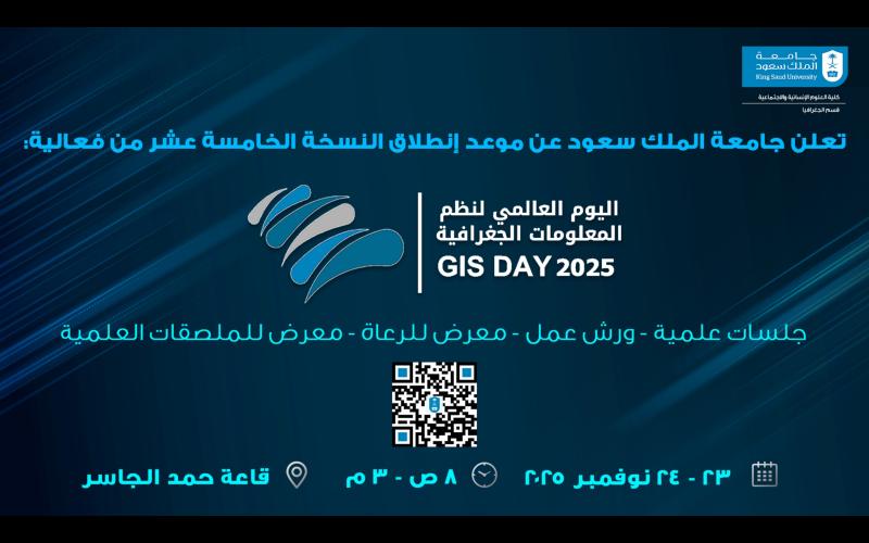 تنطلق في الثالث والعشرين من شهر نوفمبر القادم لعام 2025 أعمال فعالية "اليوم العالمي لنظم المعلومات الجغرافية GISDAY 2025" بنسخته الخامسة عشر في رحاب جامعة الملك سعود بتنظيم من قسم الجغرافيا بكلية العلوم الإنسانية والاجتماعية بالتعاون مع الجمعية الجغرافية السعودية وذلك في قاعة حمد الجاسر بمركز الجامعة. ويجري تنظيم هذه الفعالية بشكل سنوي منذ عام 2011 تحت مظلة جامعة الملك سعود، حيث تقام هذه الفعالية احتفالا بنظم المعلومات الجغرافية وتقنياتها وتطبيقاتها المختلفة وهي التقنيات الحديثة التي تساعد في تحليل البيانات المرتبطة بالمواقع والأماكن الجغرافية، ما يساعد على تقديم فهم أكبر للواقع المكاني وتصميم وإنتاج الخرائط وحل المشكلات الطبيعية والبشرية المرتبطة بالمكان.