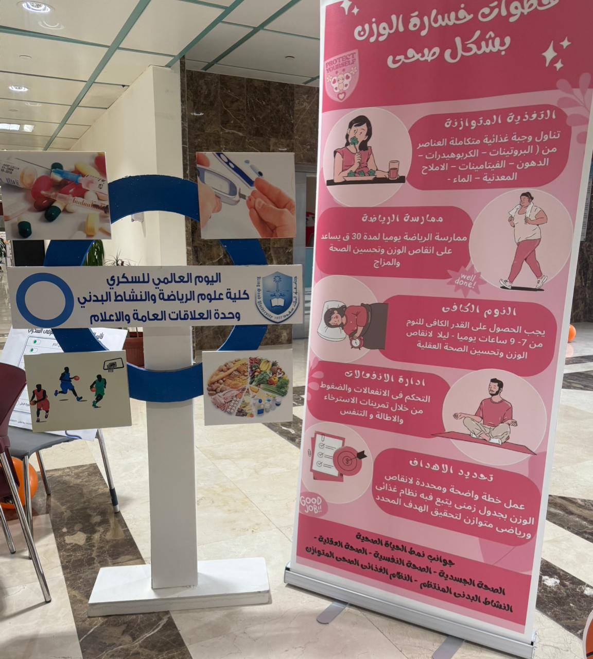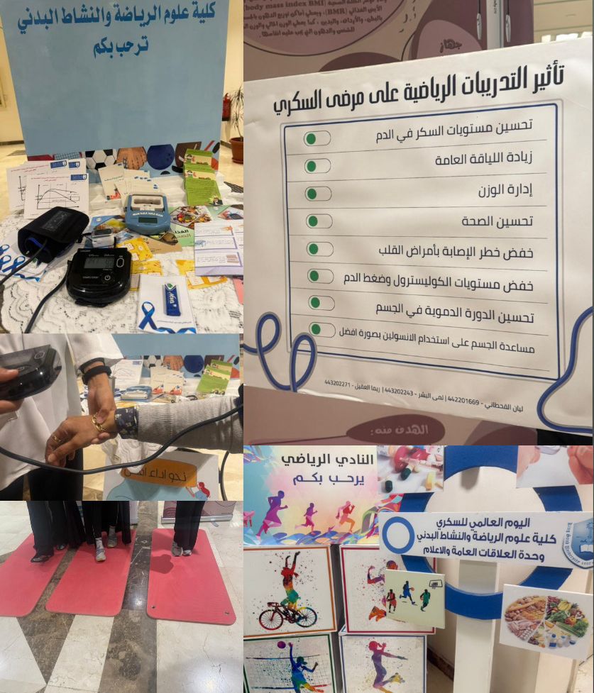 أقامت كلية علوم الرياضة والنشاط البدني فعالية اليوم العالمي للسكري وذلك يوم الأحد الموافق 25 جمادى الأولى 1447هـ في بهو الكلية.وشهدت الفعالية إقبالاً واسعاً من منسوبي الكلية؛ حيث اشتملت على قياسات طبية، بالإضافة إلى توزيع بروشورات توعوية حول داء السكري وطرق الوقاية منه.كما قدم الطالبات المشاركات شرحًا حول أهمية ممارسة النشاط البدني ودوره في الوقاية من داء السكري ، وقد تم عرض بعض التمارين الرياضية.