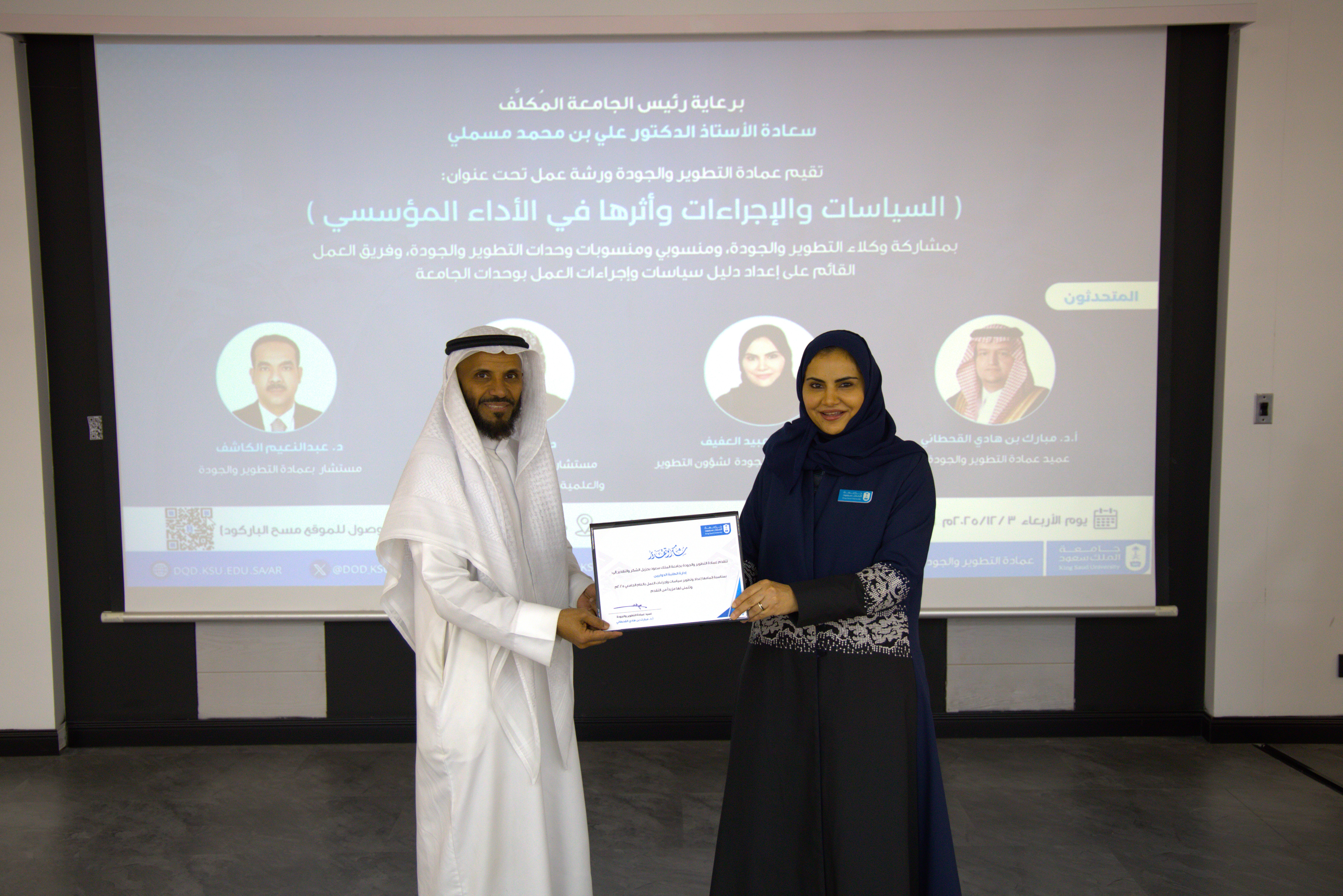 برعاية رئيس الجامعة المُكلَّف سعادة الأستاذ الدكتور علي بن محمد مسملي عقدت عمادة التطوير والجودة ورشة عمل بعنوان: السياسات والإجراءات وأثرها في الأداء المؤسسي، بمشاركة سعادة وكلاء التطوير والجودة، ومنسوبي ومنسوبات وحدات التطوير والجودة، وفريق العمل القائم على إعداد دليل سياسات وإجراءات العمل بوحدات الجامعة، وذلك يوم الأربعاء 3/12/2025م الموافق 12/6/1447هـ من الساعة (10) صباحًا إلى (12:30) ظهرًا؛ بمعهد ريادة الأعمال، قاعة كود، وتضمنت الورشة استعرض ومناقشة (3) أوراق عمل، وتكريم وحدات الجامعة التي أتمت إعداد وتطوير سياسات وإجراءات العمل بالعام2025م.