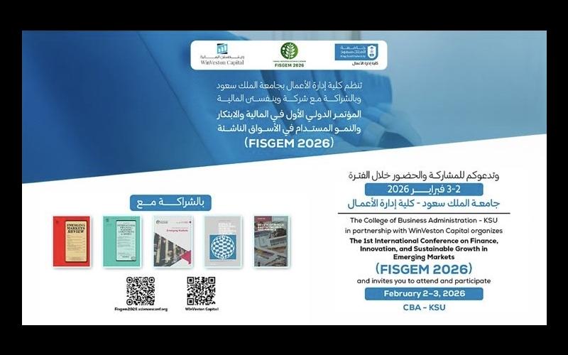 تنظم جامعة الملك سعود ممثلة بكلية إدارة الأعمال المؤتمر الدولي الأول في المالية والابتكار والنمو المستدام في الأسواق الناشئة (FISGEM)، بالشراكة مع شركة وينفستن المالية (Winveston)، وذلك يومي الاثنين والثلاثاء 2–3 فبراير 2026م، في رحاب الكلية .