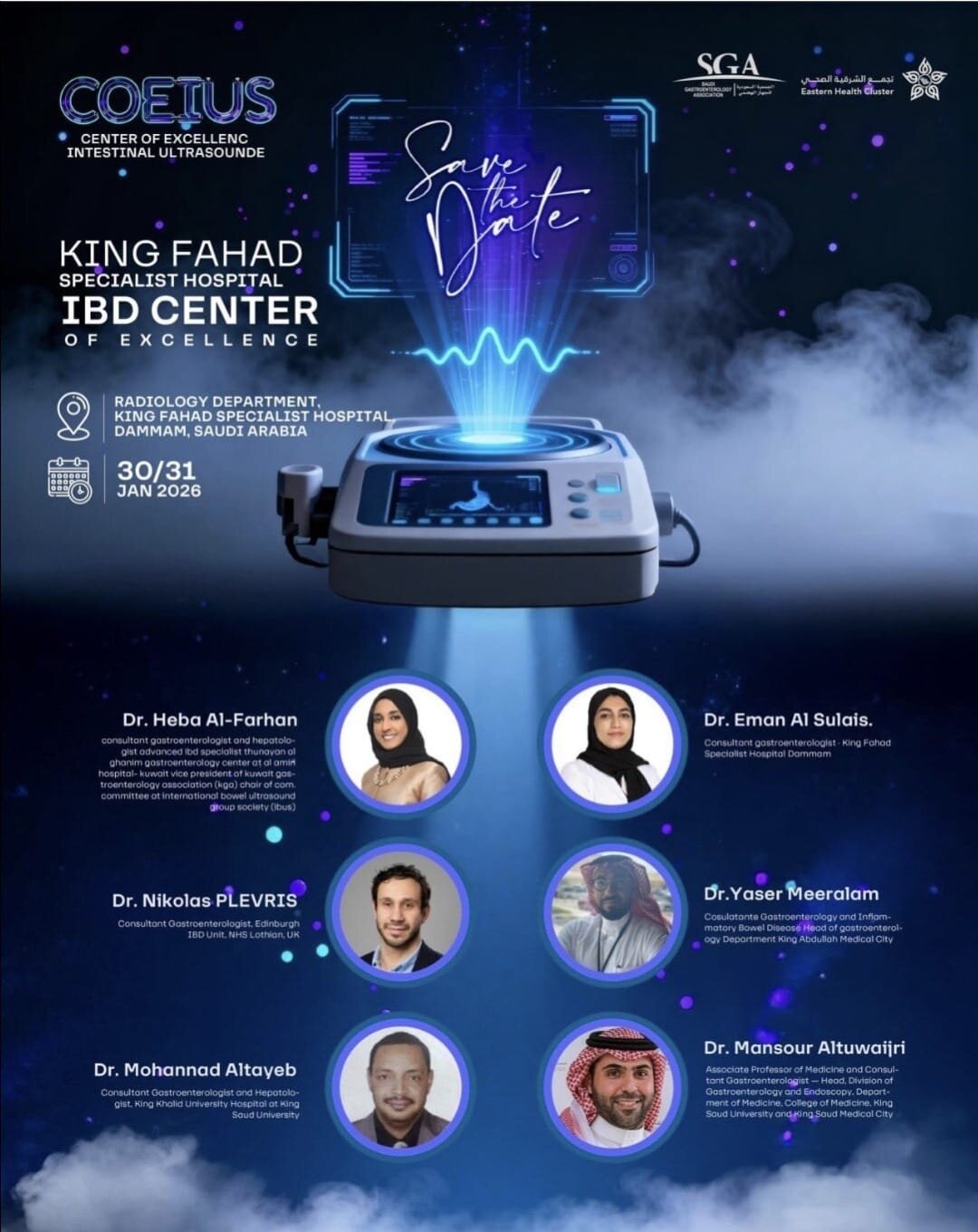 كما تشمل الفعالية تجربة تعليمية عملية متقدمة في مجال الموجات فوق الصوتية المعوية (Intestinal Ultrasound – IUS)، تُقام في مركز التميز لأمراض الأمعاء الالتهابية بمستشفى الملك فهد التخصصي في الدمام، وتهدف إلى تعزيز المهارات التشخيصية العملية للأطباء والممارسين الصحيين باستخدام تقنيات غير تدخلية وحديثة.