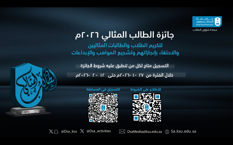 أعلنت عمادة شؤون الطلاب عن انطلاق مسابقة جائزة الطالب المثالي على مستوى الكليات والجامعة لهذا العام 1447هـ-2026م وذلك بدأً من يوم الثلاثاء 27 يناير 2026م ، ويستمر تلقى ترشيحات الكليات للطلاب والطالبات حتى يوم الخميس 12 فبراير 2026م وقد ذكر عميد شؤون الطلاب سعادة الدكتور علي بن كناخر الدلبحي أن جائزة الطالب المثالي تعتبر جائزة سنوية تمنحها جامعة الملك سعود ممثلةً بعمادة شؤون الطلاب تكريماً وتقديراً لطلاب وطالبات الجامعة المتميزين, وذلك امتداداً لسياسة جامعة الملك سعود في دعم وتشجيع الطلاب والطالبات على التميز الأكاديمي والإشادةً بمهاراتهم وطاقاتهم الإبداعية في الجوانب اللاصفية، وسعيًا إلى إبراز الطلبة المتميزين في مجالات مختلفة مثل التفوق الأكاديمي والمشاركة في الأنشطة الطلابية، والمبادرات القيادية والمشاركة في الاعمال التطوعية, ولشحذ همم الطلبة وتشجيعهم على التميز حيث تعكس هذا الجائزة إرادة الطلبة واجتهادهم في التفوق العلمي والتميز في كآفة المجالات. وتمر المسابقة بعدة مراحل بداً من المرحلة الأولى وهي ترشيح الكليات لعدد من الطلاب والطالبات ممن ينطبق عليهم شروط ومعايير الجائزة وكذلك الترشيح الذاتي حيث يقوم الطلبة بترشيح انفسهم لنيل هذه الجائزة, يتم بعدها إكمال إجراءات المفاضلة بينهم, تليها المرحلة الثانية وهي اختبار الثقافة العامة الذي يشمل الثقافة التي اكتسبها الطلبة من معارف ومهارات, يليها فرز المرشحين وتأهيل أفضل الطلاب والطالبات المرشحين إلى المرحلة النهائية وهي المقابلة الشخصية للتنافس على لقب الطالب المثالي. وقد تم وضع عدد من الشروط والمعايير للجائزة يمكنكم الاطلاع عليها عبر الرابط : https://sa.ksu.edu.sa/ar/conditions