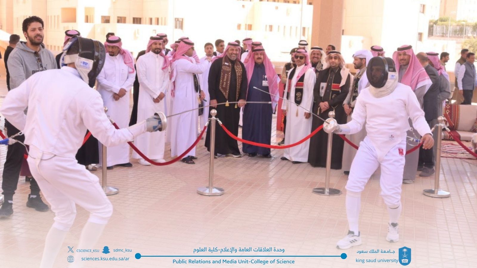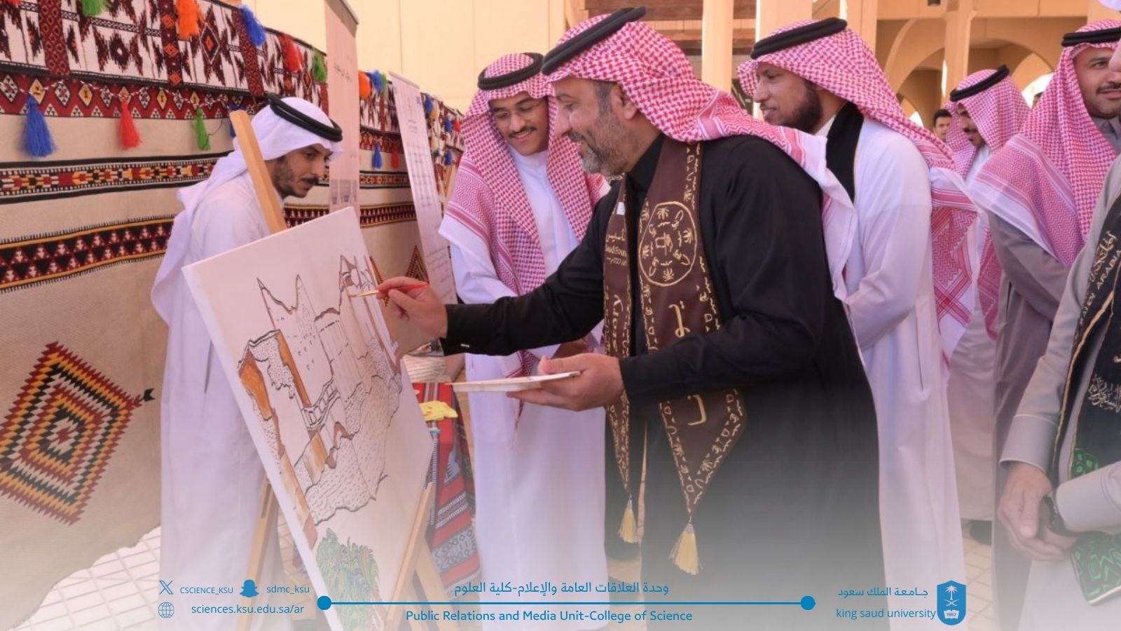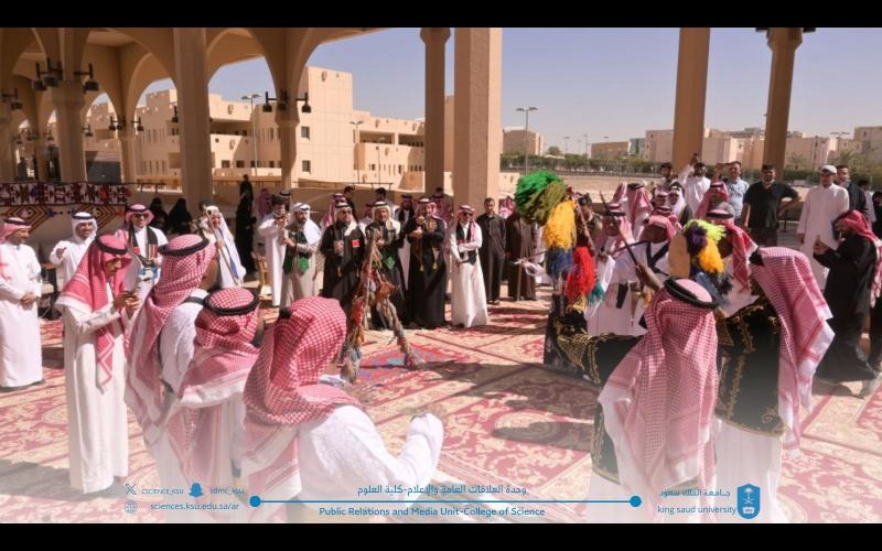 ‎كما برزت مشاركة طلاب كلية العلوم بارتدائهم الأزياء التراثية، في مشهد عكس روح الانتماء والاعتزاز بالهوية الوطنية، وأتاح للمشاركين فرصة استحضار صفحات مشرقة من التاريخ السعودي وإبراز التنوع الثقافي الغني الذي تزخر به المملكة بمختلف مناطقها وألوان تراثها وحضارتها.