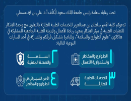تحت رعاية سعادة رئيس جامعة الملك سعود المُكلَّف أ.د. علي بن محمد مسملي تنظم كلية الأمير سلطان بن عبدالعزيز للخدمات الطبية الطارئة بالتعاون مع وحدة الابتكار للتقنيات الطبية في مركز الابتكار بمعهد ريادة الأعمال والمدينة الطبية الجامعية، هاكاثون “علوم الطوارئ والسلامة”، وذلك خلال الفترة من 5 – 7 فبراير