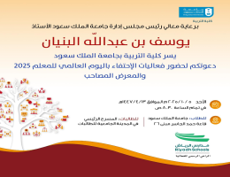 برعاية معالي رئيس مجلس إدارة جامعة الملك سعود الأستاذ يوسف بن عبدالله البنيان، تنظم جامعة الملك سعود ممثلةً بكلية التربية حفل الاحتفاء باليوم العالمي للمعلم، وذلك يوم الأحد 13 ربيع الآخر 1446هـ، الموافق 5 أكتوبر 2025م، في قاعة الشيخ حمد الجاسر (مبنى 26)، عند الساعة الثامنة والنصف صباحًا. وقد أعلنت