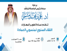 عمادة تطوير المهارات تستعد لعقد لقاءها السنوي تستعد عمادة تطوير المهارات بجامعة الملك سعود لعقد اللقاء السنوي يوم الخميس 18 ديسمبر 2025م (الساعة 10:00 –1:00)، وذلك برعاية وحضور سعادة رئيس الجامعة المكلف وسعادة الأستاذ عبدالمجيد القصيبي كبير مسؤولي الموارد البشرية وسعادة عميد العمادة ووكلائها ورؤساء