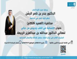 برعاية عميد كلية الطب الدكتور بندر بن ناصر الجفن تنظم كلية الطب بجامعة الملك سعود يوم الخميس 5 فبراير 2026م، محاضرةً لمعالي الدكتور عبدالله بن عبدالعزيز الربيعة المشرف العام على مركز الملك سلمان للإغاثة والأعمال الإنسانية لإلقاء محاضرة العميد للعام 2026م بعنوان (الإنسانية في الطب، ودروس من حياتي) في