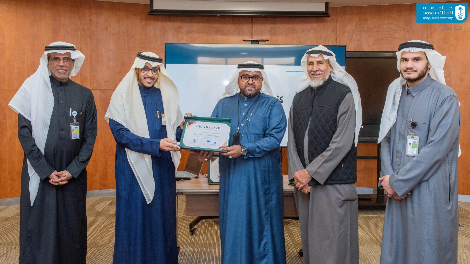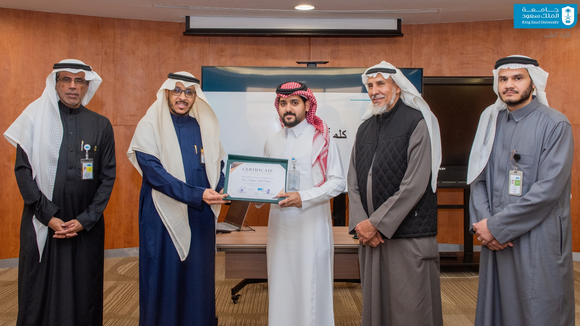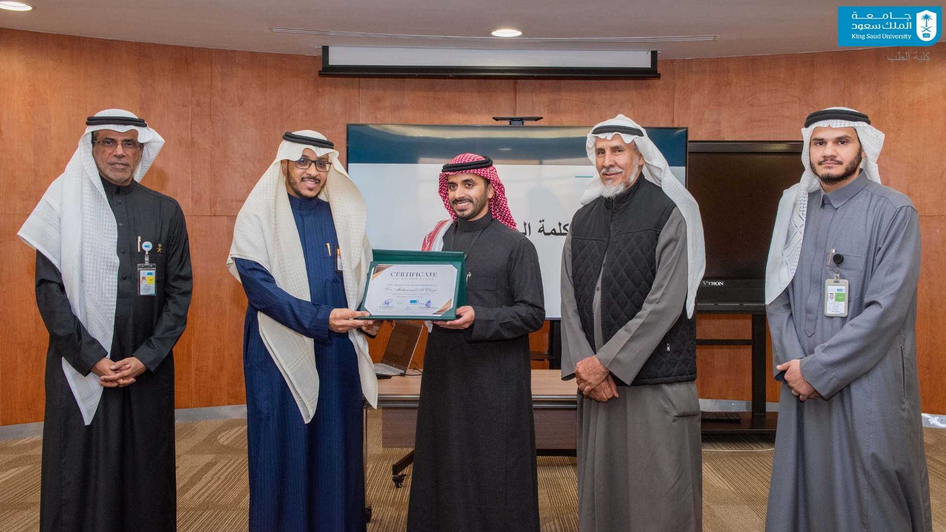 Under the patronage of the Dean of the College of Medicine, Dr. Bandar Al-Jafan, and in the presence of the Executive Director of Health Affairs at the University Medical City, Dr. Abdulaziz Al-Thunayan, and the Vice Dean of the College of Medicine for Graduate Studies and Scientific Research, Professor Dr. Assim Al-Fadda, the University Center for Sleep Medicine and Research at the College of Medicine organized the graduation ceremony of the Sleep Medicine Fellowship for the year 2025, with graduates from various regions of the Kingdom, on Wednesday, December 24, 2025, at Ibn Sina Hall. The ceremony was attended by honored guests and male and female staff members of the Center, marking the culmination of integrated academic and training efforts that contributed to preparing specialized medical professionals in the field of sleep medicine, thereby enhancing the quality of healthcare services provided and improving the efficiency of diagnosing and treating sleep disorders in accordance with the latest evidence-based medical practices.