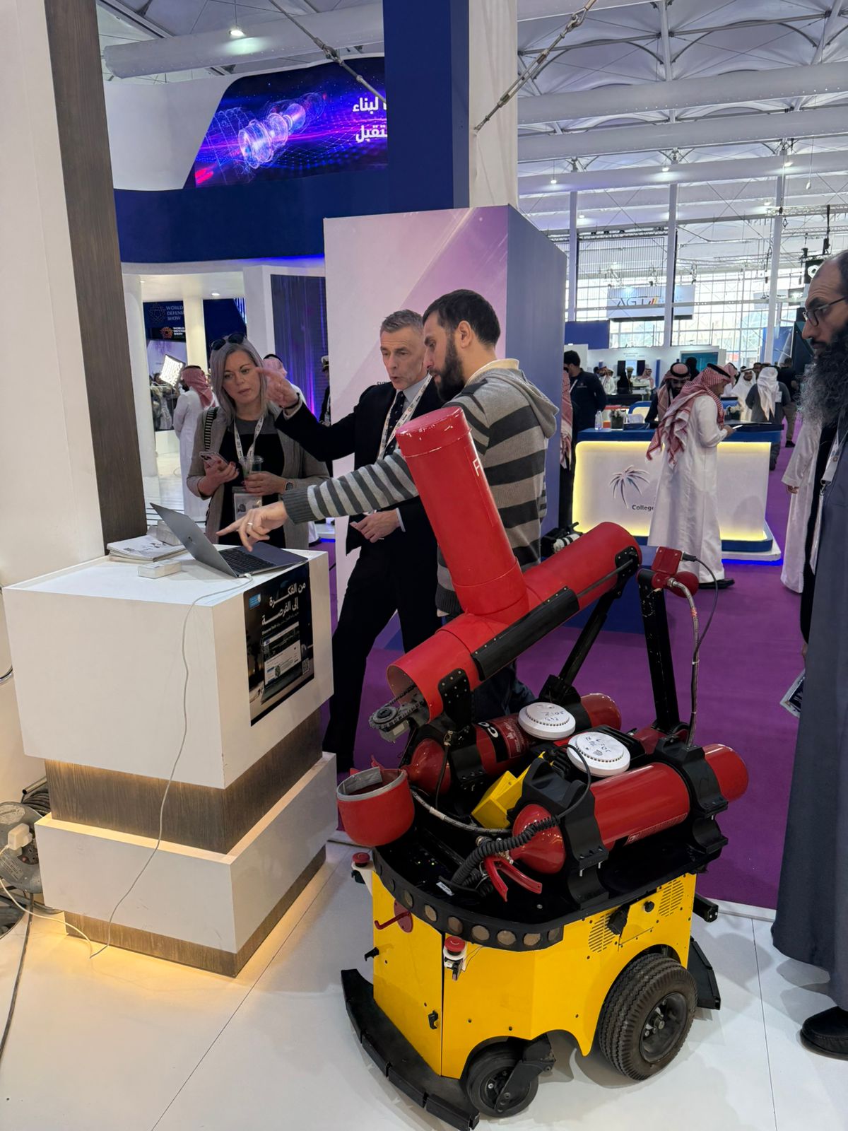 The Center for Intelligent Robotics Research participated in the World Defence Exhibition, showcasing its "Firefighting Robot" at its dedicated booth within King Saud University's pavilion. The Center's booth was visited by the Head of the Defense Research Authority, as well as the President of King Saud University and his deputy, who were briefed on the robot and its technical specifications.