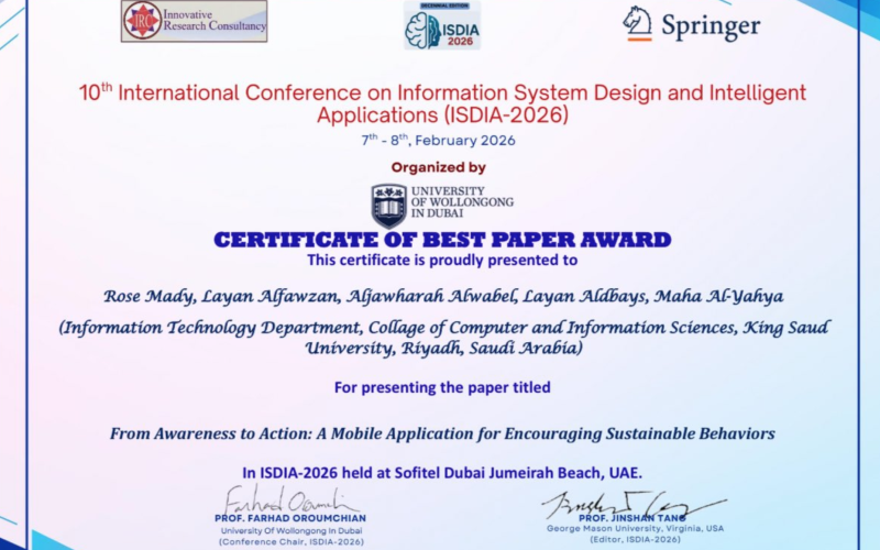Professor Dr. Maha Al-Yahya received the award for best scientific paper at the ISDIA2026 conference.