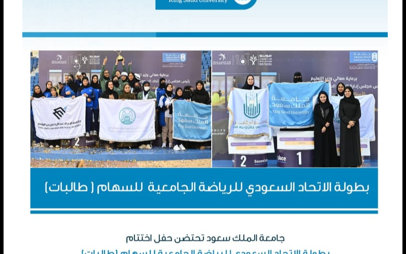 ويأتي تنظيم هذا الحدث الرياضي الكبير، تأكيدًا على حرص جامعة الملك سعود على تمكين الطالبات رياضيًا، وتوفير بيئة تنافسية محفزة تساهم في تطوير مهاراتهن وتعزيز روح المنافسة الشريفة بين الجامعات، حيث فاز منتخب جامعة الملك سعود للطالبات للسهام بالمركز الثالث، وحقق المنتخب المركز الأول في المنافسات الفردية، والمركز الثالث في المنافسات الجماعية..