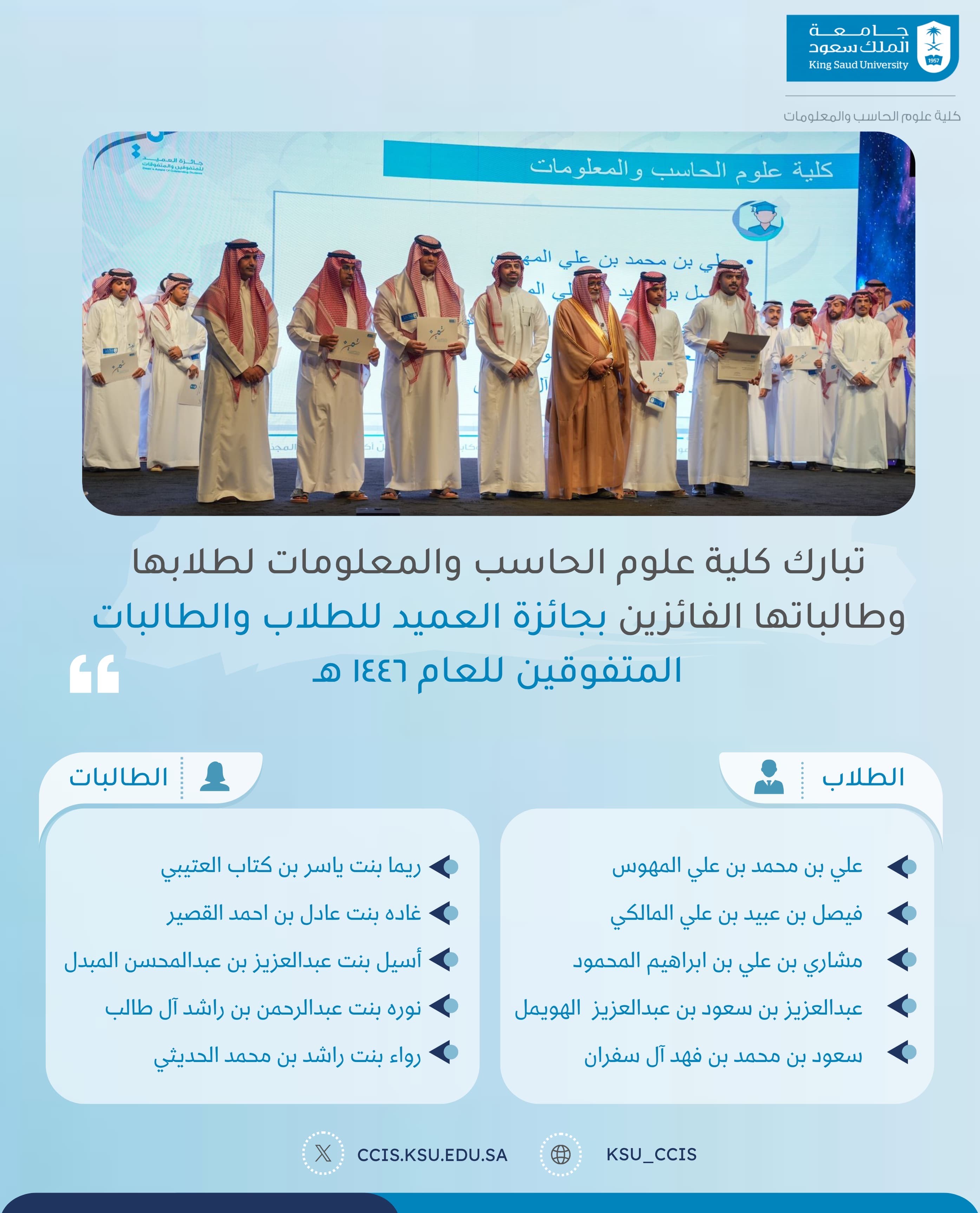 حصول طلاب وطالبات كلية علوم الحاسب و المعلومات المتفوقين على جائزة العميد للتفوق لعام 1446هـ / 20 أكتوبر 2025 / تبارك كلية علوم الحاسب و المعلومات لطلابها و طالباتها الفائزين بجائزة العميد للتفوق 1446هـ