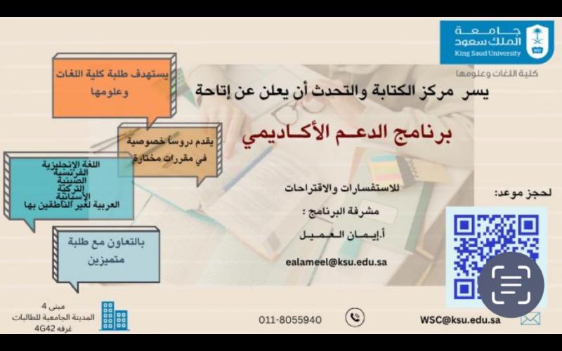 يعلن مركز الكتابة والتحدث في كلية اللغات وعلومها عن انطلاق برنامج الدعم الأكاديمي المخصص لتعزيز التجربة التعليمية للطلبة في الكلية وتقديم المساندة في عدد من المقررات الدراسية، وذلك بالتعاون مع نخبة من الطلبة المحترفين والمؤهلين من تاريخ ٤ نوفمبر ٢٠٢٥وحتى تاريخ ١١ ديسمبر ٢٠٢