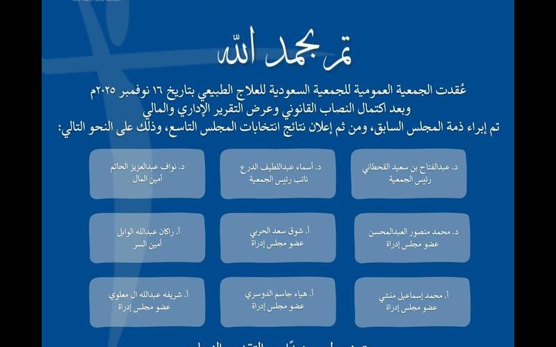 تم بحمد الله عقد الجمعية العمومية للجمعية السعودية للعلاج الطبيعي بتاريخ 16/11/2025م ، وبعد اكتمال النصاب وعرض التقرير الإداري والمالي، تم ابراء ذمة المجلس السابق ثم اعلان نتائج الانتخابات لأعضاء مجلس إدارة الجمعية التاسع، وهي كالتالي :