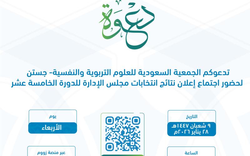 تدعوكم الجمعية السعودية للعلوم التربوية والنفسية- جستن لحضور اجتماع إعلان نتائج انتخابات مجلس الإدارة للدورة الخامسة عشر بمشيئة الله تعالى – في تمام الساعة الواحدة من ظهر يوم الأربعاء 9 شعبان 1447هـ الموافق 28 يناير 2026م، عبر برنامج الزووم