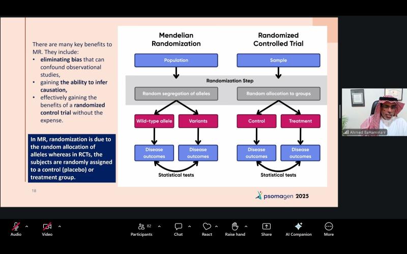 The lecture aimed to provide a comprehensive overview of the concept of Mendelian randomization in medical research, highlight common errors in the analysis and interpretation of this type of study, and clarify key concepts and terminology in a simplified manner to assist specialists and interested participants in understanding and applying them correctly. The event was attended by faculty members, researchers, and interested participants. The lecture focused on empowering participants to critically appraise Mendelian randomization studies, enhancing in-depth understanding of their scientific principles, strengths, and limitations, in addition to reviewing the use of big data in this type of research and its impact on the quality of research outputs.